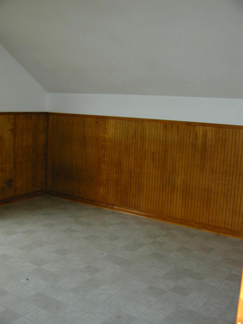 Renovation of the rest of the house went smoothly in that first year: new floors, new paint, new trim, no problem. But we soon discovered that behind all that panelling in that upstairs room was half-inch plywood. The original drywall had been removed, the original electrical boxes sanded back so the plywood could go over it all, and the panelling installed over all of that. Each plywood board was put in place with what appeared to be every single nail in the world.